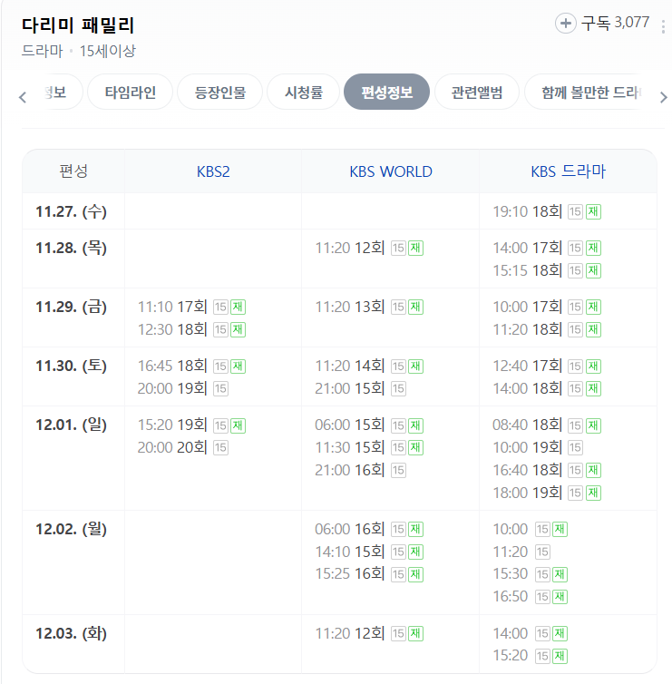 3. 재방송 시간 확인 : '편성표' 또는 '프로그램 안내' 섹션에서 다리미 패밀리의 재방송 시간을 확인합니다.